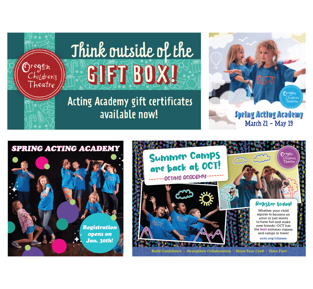 These designs reflect different seasons for a program called Acting Academy. The branding changes per season to help attract new students. I created social media graphics and other assets for the website and email marketing.