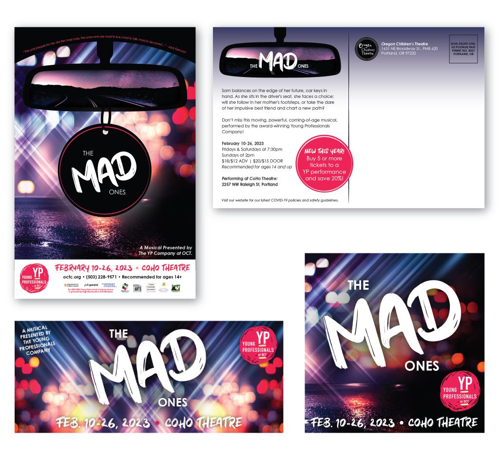 For this play, I created a poster, postcard, and assets for the website, email, and display ads. I also laid out a digital playbill and designed printed signs for the show.
